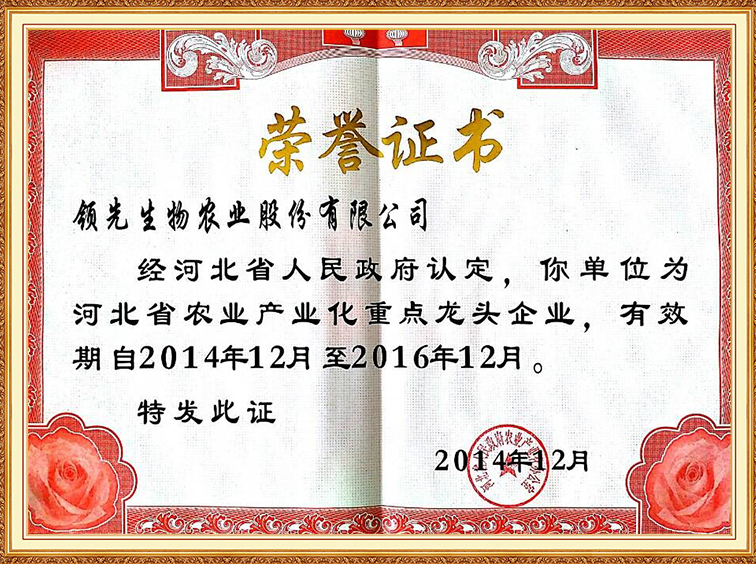 河北省農(nóng)業(yè)產(chǎn)業(yè)化重點(diǎn)龍頭企業(yè)證書